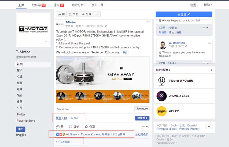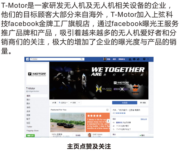 高級策劃顧問與T-motor溝通公司的品牌和產品定位,精選四個品牌產品關鍵詞;結合Facebook等社交媒體對用戶及用戶人群的定位,選取符合關鍵詞定位的上中游用戶群推廣T-motor,向真正對 T-motor的產品感興趣的意向客戶或關聯客戶精準曝光T-motor的品牌、產品及金牌工廠旗艦店。