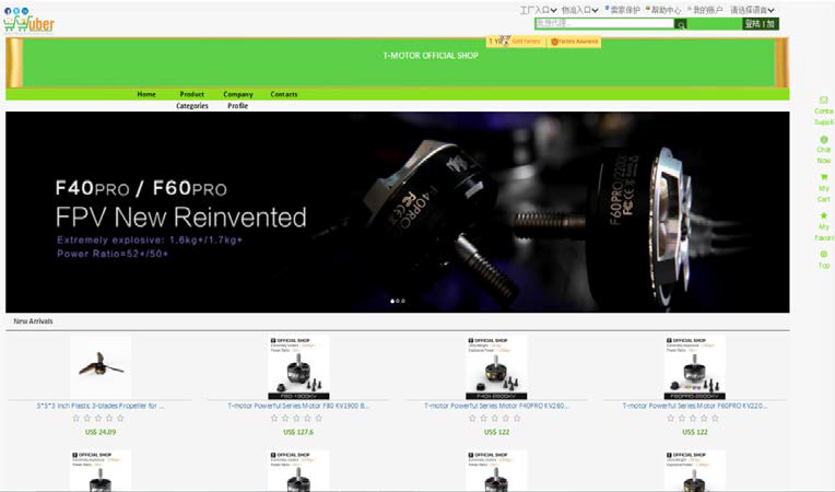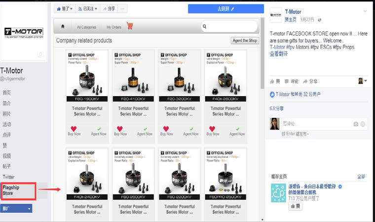 首先在擁有24億用戶的Facebook企業主頁上建立Facebook金牌工廠旗艦店,展示T-motor的各規格產品商品,通過資質審核獲得全球金牌工廠認證。需要購買的客戶分別通過BuyNow和AgentNow 進行購買和分銷;然后建立全球品商分銷中心頁,前端在線招募分銷商,后臺管理分銷商及旗艦店業務。