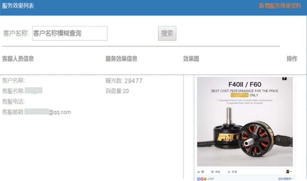 | 主動精準曝光 | 精選4個品牌產品關鍵詞 | 海外團隊通過企業市場定位條件精準鎖定目標FB用戶群體,將企業業務信息大量分享曝光出去,吸引FB用戶進一步關注了解企業業務,讓產品和品牌更深度傳播,沉淀老客戶,拓展新客戶