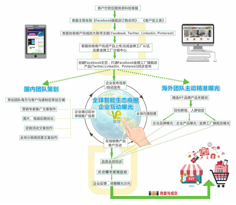 一站式專業服務:幫助企業建立專業、有條理、有活躍度的Facebook企業專頁,在Facebook上創建全球獨一無二的集展示、分享、銷售、分銷于一體的金牌工廠旗艦店,實現企業客戶一站式購買分銷,避免跳轉流失客戶,是客戶到訂單轉化的最佳方式,解決企業銷售難題。